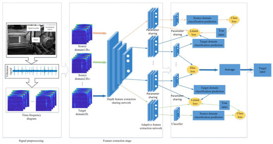 In practical engineering applications, the data acquisition conditions for rolling bearing status are complex and diverse due to the influence of speed, noise, load, and other factors. It is inevitable that the data label information is not comprehensive and is different from the information distribution of the training data sample [4]. Although deep learning technology performs well in fault diagnosis, it is difficult to achieve ideal results for mechanical fault diagnosis problems with inconsistent data distribution under different working conditions [5]. To solve the above problems, Tan et al. [6] built a neural network by stacking multiple sets of sparse auto-encoders and used a supervised fault diagnosis method to fine-tune the network. Shao et al. [7] achieved good diagnostic results on three fault datasets by fine-tuning the VGG-16 network’s high-level architecture. However, the fine-tuning method does not completely solve the problem of insufficient target domain labels. When facing the problem of label-free target domain data, it is difficult to achieve effective diagnosis by fine-tuning the model alone.