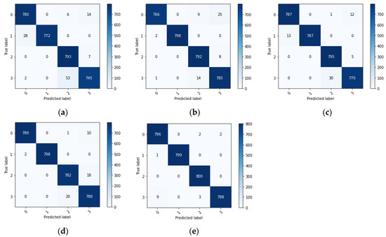 The target domain samples are input into the trained network, and the fault features extracted from the last layer of the network are reduced to a two-dimensional plane. The results are shown in Figure 6, where different colors represent different class labels. It can be seen that there is still more cross-over after extracting features using the four comparison methods (a–d). After feature extraction using the proposed method, the four classes of faulty samples have basically been separated, and the target samples can be better classified. The specific recognition accuracy is shown in Table 4. It can be observed that the recognition accuracy of method (a) is 97.81%, the recognition accuracy of method (b) is 98.53%, the recognition accuracy of method (c) is 98.75%, the recognition accuracy of method (d) is 98.81%, and the recognition accuracy of method (e) is 99.65%, which is higher than the other four methods.