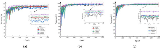 The diagnostic accuracies of the different adaptive methods for three sets of migration tasks are shown in Table 4. Figure 8 shows the variation curve for target domain sample accuracy with the number of iterations in the three sets of tasks. In order to show the contrast effect more clearly, the change curve of the number of iterations greater than 1100 times is locally amplified.