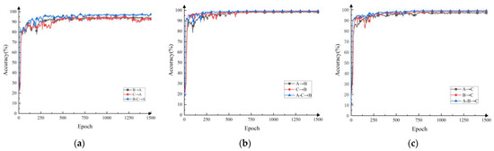 It can be seen from Figure 11 and Table 5 that the accuracy of the multi-source domain fault diagnosis method is significantly higher than the corresponding single-source domain fault diagnosis method, which can better classify the target domain samples. For example, the accuracy of the multi-source domain method, B-C→A, can reach 97.78%, whereas the diagnostic accuracy of the single-source domain methods, B→A and C→A, can only reach 95.09% and 96.13%, and the classification accuracy is improved by 1.97% and 1.56%, respectively. To a certain extent, this can be explained that under complex working conditions, a multi-source domain can learn richer domain-invariant feature information more effectively than a single-source domain.