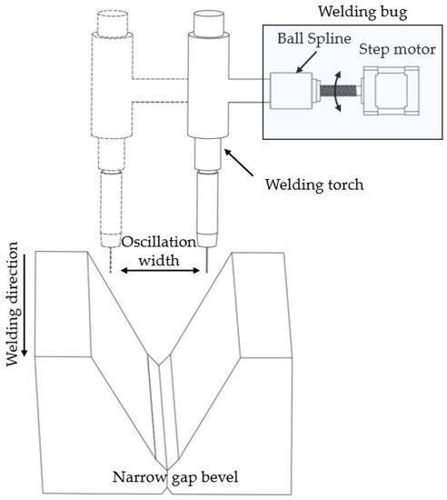 Figure 1 shows the schematic diagram of the vertical oscillation arc welding torch for NG-GMAW. The ball spline converts the rotary motion of the ball screw driven by the stepper motor into the reciprocating motion of the welding torch. Then the vertical oscillation arc forms with the welding torch movement, and it is used to weld the narrow gap bevel. A welding bug takes this set of oscillation mechanisms to move around the pipe in all positions for girth welding.