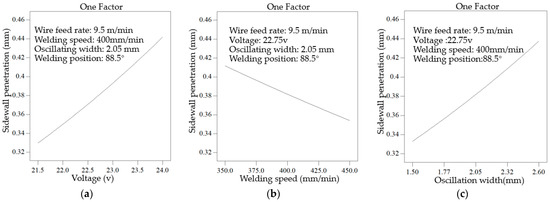 Effect of (a) Voltage, (b) Welding speed, and (c) Oscillation width on sidewall penetration.