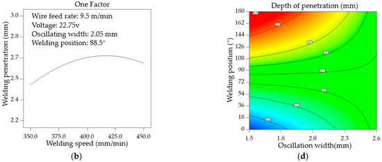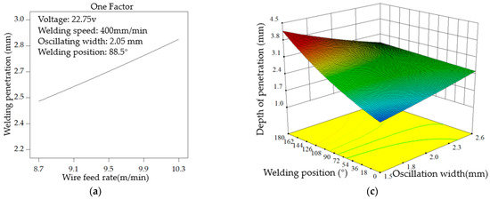 Figure 8c,d show that the oscillation width and the welding position affect the welding penetration. When the oscillation width increases from 1.5 mm to the critical point, the welding penetration increases sharply with the increase in the welding position. Moreover, the oscillation width further increases until it exceeds the critical point. It is found that as the welding position increases, the corresponding welding penetration increases slowly. This may be attributed to the influence of the gravity force on the molten pool along the opposite direction, which results in different variation trends of the oscillation width and uneven stability of the molten pool.