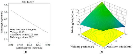 The results of ANOVA for the welding height model is presented in Table 6. The p-value of model terms shows that has the most significant effect on the welding height. The interaction items of oscillation width and welding position (), and the second-order term () are significant terms in modeling welding height . The F value and p-value indicate that the model is significant, and the Lack of Fit item demonstrates that the model of the welding height is adequate. The ultimate statistical model for the welding height in terms of actual factors is as the following: