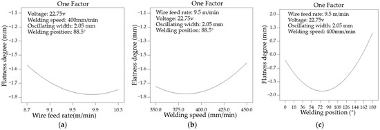 Effect of (a) Wire feed rate, (b) Welding speed, and (c) Welding position on the flatness degree.