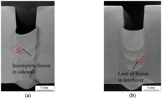 Studies show that incomplete fusion in the sidewall and interlay are very prone to form in NG-GMAW [2,7]. This is even more pronounced in vertical and overhead positions, where the same defect appears in the vertical oscillation arc NG-GMAW. As the welding position increases, the gravity force on the molten pool intensifies, so more molten filler metal flows to the rear of the weld pool and solidifies there. Subsequently, a convex shape forms in the middle of the weld bead. It is worth noting that the welding arc in the next layer cannot reach the lowest position of the convex weld, which results in incomplete fusion on the interlayer. Insufficient heat input on the sidewall of the groove will cause incomplete fusion on the sidewall. In this regard, the incomplete fusion in the sidewall and interlayer in NG-GMAW are shown in Figure 11a,b, respectively.