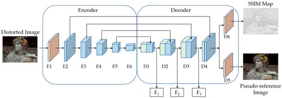 The decoder consists of six deconvolutional layers, D1–D6, which perform upsampling on the high-level features of distorted images to generate the pseudo-reference image and SSIM map. Through multi-level skip connections, the decoder effectively preserves the detailed information in the input image while avoiding the loss of feature details caused by pooling layers, thus improving the image restoration performance. D1–D6 are all composed of 3 × 3 deconvolutional layers, where the stride of D1–D4 is 2, and the stride of D5 and D6 is 1. The specific structural parameters of the image restoration sub-network are summarized in Table 1.