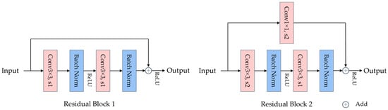 The multitask image restoration sub-network accepts the distorted image as input and generates the pseudo-reference image, the SSIM map, and the quality restoration features , , and as its outputs. The encoder consists of six convolutional modules, E1-E6. E1 is a single-layer convolutional layer composed of 3 × 3 convolution kernels with a stride of 1. To avoid gradient vanishing [39] when deepening the model and to reuse low-level features, E2–E6 use residual convolutional blocks for downsampling. The specific structures of two types of residual blocks are shown in Figure 3. E2 employs a residual block 1 architecture, comprising two 3 × 3 convolutional layers with stride 1. Notably, this architecture preserves the size of the input. For E3–E6, they employ the residual block 2 architecture, which comprises a 3 × 3 convolutional layer with stride 2 and another 3 × 3 convolutional layer with stride 1. Consequently, the output size is reduced by half compared to the input size Since the sizes of the input and output feature maps are inconsistent, a 1 × 1 convolution with a stride of 2 is performed on the input during the residual connection to match their sizes.