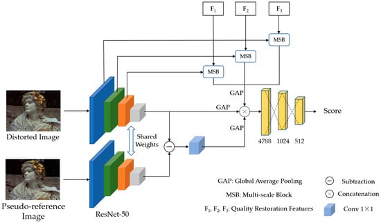 A score prediction sub-network is used to extract features from distorted and pseudo-reference images and to predict image quality scores, as shown in Figure 4. The score prediction sub-network takes distorted images, pseudo-reference images, and quality restoration features , , as inputs, and a pre-trained ResNet-50 [40] on ImageNet [41] is used as a feature extractor to extract the content features of the image. First, the outputs of Conv2_10, Conv3_12, and Conv4_18 in ResNet-50 are used as multi-scale features of the distorted image, and are, respectively, fully fused with the quality restoration features , , extracted by the image restoration sub-network through the multi-scale features fusion block. Then, the high-level features of the distorted image, namely the output of Conv5_9 in ResNet-50, are subtracted from the high-level features of the pseudo-reference image. After dimension reduction by a 1 × 1 convolution, the difference feature between the distorted and pseudo-reference images is obtained. Finally, the high-level feature, multi-scale feature, and difference feature are globally average-pooled, concatenated, and mapped to quality scores by fully connected layers.