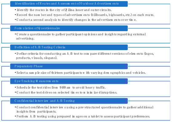The third step in the process was to define the criteria for conducting an A/B test. A/B testing is a scientific approach to comparison, in which two versions of a particular element—such as a logo, product, graphic visual, or slogan—are evaluated against each other to determine which version performs better [46]. The randomly assigned participants of the study were presented with elements A and B after the completion of their drive, both on the outer and inner circuits. Subsequently, the drivers were asked four questions to assess which variant was more appealing: (1) Which option do you prefer when making a purchase—A or B? (2) What led you to choose this option? (This was an open question.) (3) Did you register the selected logo or product during the test drive? (Answers were limited to yes/no.) (4) Is there a specific product associated with the logo you saw? (Answers were limited to yes/no, and this question was applicable only to the logos of companies.)