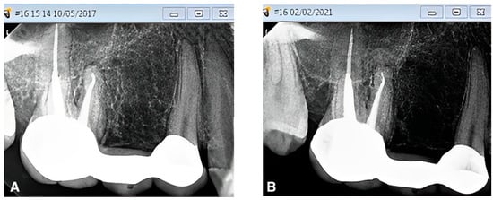 (A,B). Peri-apical radiograph in Group I (no gap between cemented post and remaining gutta-percha) showing the PAI status, before and after 4 years of follow up using the CS-R4 program.