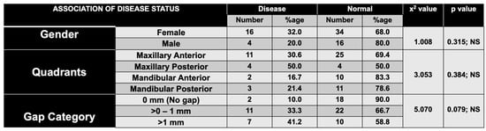 Association of disease status with respect to gender, quadrant, and gap categories. NS = non-significant.