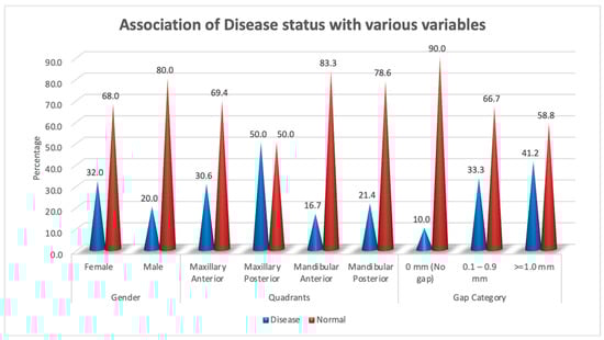 Graphic illustration of association of disease status with respect to gender, quadrant, and gap categories.