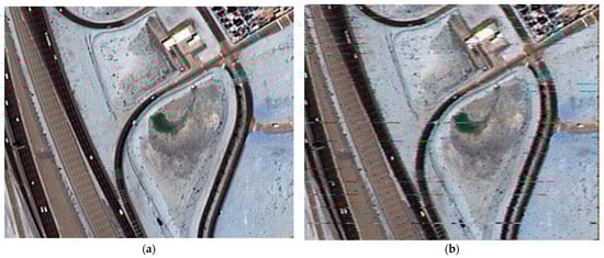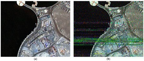 To denote a situation where distortions are inevitable, an analog image transmitter was emulated to capture noisy aerial images. The transmitter and receiver were kept at a distance with many obstacles between them. The details of an image are converted to many low-frequency tones to be frequency-modulated with a radio carrier wave at the transmitter. The narrowband frequency modulation (NBFM) type was used, and the carrier frequency was 433 MHz. Image i was transmitted through the air, received as image i’. With this process, 120 images were collected. Figure 4 shows dissimilarities between the transmitted image and the received image.