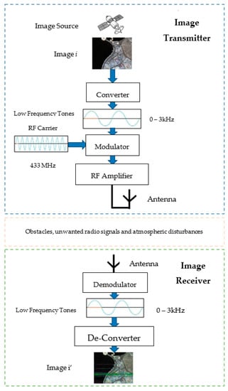 The workflow used in analog image transmitters and receivers is depicted in Figure 3. An aerial image from a proper source is converted to set of low-frequency tones between 0 Hz and 3 kHz. These tones are frequency-modulated with a radio frequency (RF) carrier. The characteristics of the RF carrier are determined according to the relevance of the situation, how the transmission process must be accomplished, and by considering the possibilities of acquiring a proper license to transmit. For the work conducted in this paper, a 433 MHz carrier frequency was used, which is a part of the non-licensed industrial, scientific, and medical (ISM) band. The modulated RF carrier is amplified and transmitted over the air by using a proper antenna. The image receiver obtains that signal from its antenna, demodulates it, then de-converts it to obtain the image which was sent.