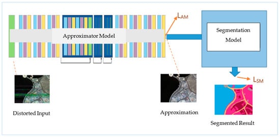 First, the proposed approximator network is trained end-to-end with distorted aerial images targeting referencing images to make a proper approximation for the segmentation model. Mainly it is conducted to see the efficiency of the derived combined loss function. For that task, we considered only the loss of the approximator model LAM. Distorted and approximated aerial images can be segmented using a pre-trained U-net to compare the effects of approximation. Finally, by using the proposed combined learning method, the proposed approximator network is trained again, and the results are segmented. Figure 6 depicts the combined learning method. The loss of the approximator model is LAM, and the loss of the segmentation model is LSM. Learning is conducted according to the combined loss LC. However, the weights of the segmentation model are not updated during the training process.