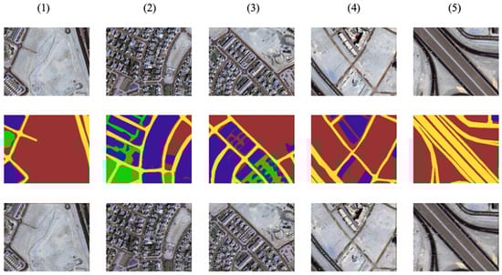 Satellite images of the Dubai dataset [39] provide their volume with segmentation labels in six classes. The classes are building, land, road, vegetation, water, and unlabeled. The provided images and segmentation labels are cropped to a size of 320 × 256. The total number of images is 1404. Even though the dataset provides its own color scheme in segmentation labels, this work used more intuitive colors for each region type (buildings: blue, vegetation: green, water: light blue, roads: yellow, unlabeled: gray). Samples from the Dubai dataset are shown in Figure 2.