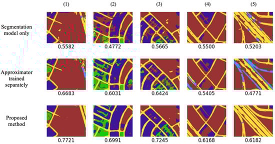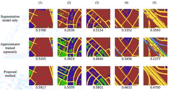 All approximations were segmented by using pretrained U-net, and the IoU scores were obtained and are shown below for each segmentation result for the proposed approximator model. Based on the observations, the proposed approximator model which was trained by using the proposed combined learning method presented a low error in approximation and a higher IoU score for semantic segmentation.