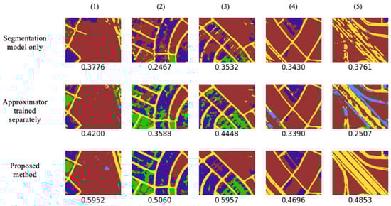 In each training scenario described in this paper, the segmentation models were trained with 500 epochs, and approximator models were trained for 1000 epochs with the Adam optimizer [40], whose parameters were set as follows: the learning rate was 0.001, β1 was 0.9, and β2 was 0.999. Training was completed on an NVIDIA Quadro 6000 RTX GPU (by NVIDIA corporation in Santa Clara, CA, USA) with the tensorflow framework. For a pretrained segmentation model, U-net was trained with the 1404 available images. The mean IoU was the evaluation metric used for the test segmentation results. Usually, the mean IoU is calculated for a set of images, but the same function can be utilized for a single image by setting the number of images per set to one. We tested three inference methods. (1) Segmentation model only—the received distorted image is directly passed to the segmentation model, (2) approximator trained separately—approximator network is trained only according to LAM, and (3) the proposed method—approximator was trained according to both LAM and LSM (Figure 6). The obtained IoU values are shown below for each result.