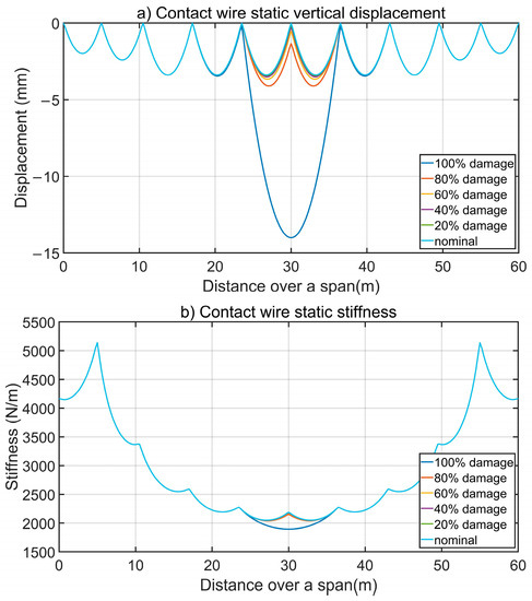 Figure 2 shows the dropper impact on the contact wire static state that consists of the vertical displacement and the static stiffness over a span. It shows that the impact of the fifth dropper’s defect increases non-linearly with the degree of damage. When the dropper nearly loses its elasticity or has done so already, the difference from the nominal condition is considerable.