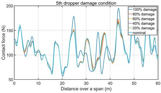 The impact of the fifth dropper’s damage on the contact force performance is presented in Figure 3. It can be seen that if the damage is minor, the difference in contact force can be negligible. On the contrary, if the fifth dropper fully malfunctions, its impact on force can propagate to the whole span and distort contact behaviour.