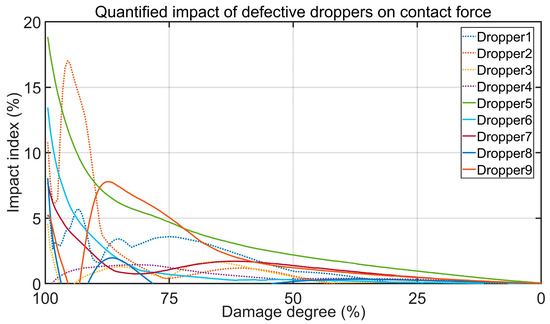 Figure 4 shows the impact index of each dropper’s defect with damage degree ranging from 100% to 0%. It is clear that each dropper’s damage has a distinctive impact on the contact performance. Regarding the index, the damage degree of each dropper is categorised into two risk categories, low risk () and high risk (). Once a damage degree is labelled, a worse degree will not be categorised as healthier than that for conservatism. The damage categorisation is summarised in Table 3. For example, if the damage of the fifth dropper is more than 27% of the nominal value, the condition will be labelled as low risk and if it is more than 62.5%, it will be labelled as high risk.