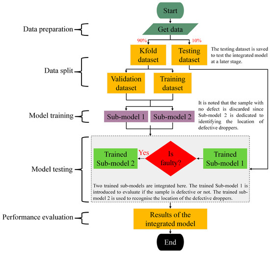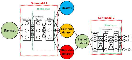 In this paper, a method based on integrating multiple 1D CNNs (integrated 1D CNN) is applied to classify the damage degree and the position of defective droppers as two independent tasks. The structure of the integrated 1D CNN model is shown in Figure 5. Specifically, Sub-model 1 considers the damage degree of droppers defined in Table 3. Sub-model 2 considers the location of defective droppers that comprises nine labels representing nine positions. It should be noted that when the dropper is identified as being healthy, it is not necessary to identify its position. Hence, Sub-model 2 is applied to train the part of the dataset which only contains the data labelled as ‘low risk’ and ‘high risk’ (i.e., data not labelled as “healthy”).