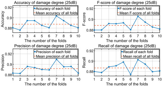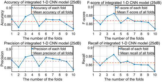 The performance in the four metrics is shown using the average values. Considering the metric values for all folds, the standard deviation of the results is small (all standard deviations are lower than 0.01); hence, the authenticity of the training and validating results is proven by using the K-fold cross-validation process. The average results trained by Sub-model 1, Sub-model 2 and the integrated 1D CNN model with different signal noise levels (dB) are presented in Table 7. The integrated 1D CNN model shows excellent classification performances in the four metrics (over 86%).