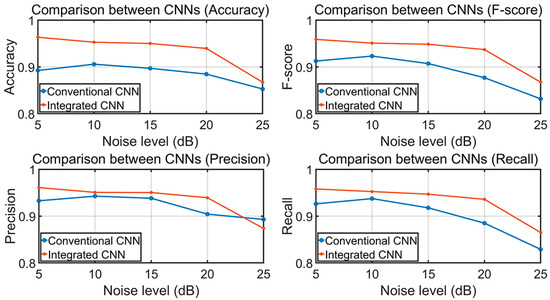 In Table 8, considering the four evaluating metrics of the integrated 1D CNN with the same noise power, the value is relatively consistent (the variance of these four values is lower than one). On the contrary, the variance of these values in the conventional 1D CNN is over 5% (at 25 dB).