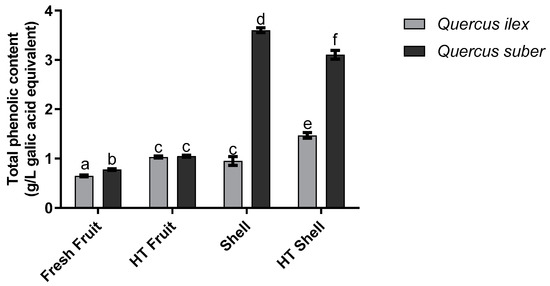 The results obtained regarding the total phenolic content of the acorn extracts can be seen in Figure 1. The first major takeaway is the statistically significant (p < 0.05) differences observed between Q. suber and Q. ilex shell and fruit’s phenolic content, with the first presenting values which were 2.1 to 3.7× times superior. This is contrary to what has been previously reported in the work of Cantos, Espín [21] as it showed that acorn’s fruit had a higher phenolic content than that of its shell’s. Similarly, the generally higher phenolic content observed for Q. suber contradicts previous works, where Q. ilex has been reported as possessing a higher content of phenolic compounds [21]. However, the higher phenolic compound content observed here for the roasted samples is in line with previous works, as the thermal treatment of samples has been shown to increase the total phenolic content of acorn extracts due to the degradation at high temperature of hydrolysable tannins present in acorn, originating either ellagic or gallic acids [22,23].