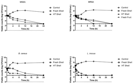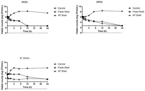 The data obtained regarding the time-death curves produced in the presence of Q. suber extracts at the MBC concentration can be seen in Figure 3. In this case, MSSA appeared to be the most susceptible microorganism, with viable counts dropping below the quantification limit after 12 h regardless of the shell extract, which demonstrates that, at MBC, Q. suber extracts appear to be more effective in inhibiting this microorganism than Q. ilex ones. Interestingly for MRSA, while the HT shell extract exhibited a similar effect that as observed for the HT shell from Q. ilex acorns (values dropped below the quantification limit at the 24 h mark), for the fresh shell extracts, the Q. suber one was less effective than the Q. ilex one, causing a reduction in viable counts below the quantification limit after 24 h instead of after 12 h, as observed for Q. ilex fresh shell. This lower effectiveness of Q. suber extracts was also observed for B. cereus. In fact, when considering the data, it can be observed that, while HT shell extracts appeared to have a stronger impact on the total viable counts, the overall effect does not drop below the quantification limit even after 24 h. As this bacteria species are known to produce spores, a test was carried out by heating the samples to 95 °C before cooling and plating; however, as no growth was observed in these scenarios, the data were not added to the manuscript, although these did show that the viable count levels observed did not originate from the presence of these structures.