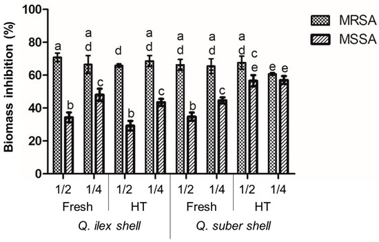 Biofilm inhibition (in percentage of biofilm’s biomass inhibition) by the different shell extracts upon MRSA and MSSA biofilm formation. Different letters above each bar mark statistically significant (p < 0.05) differences between each dataset.