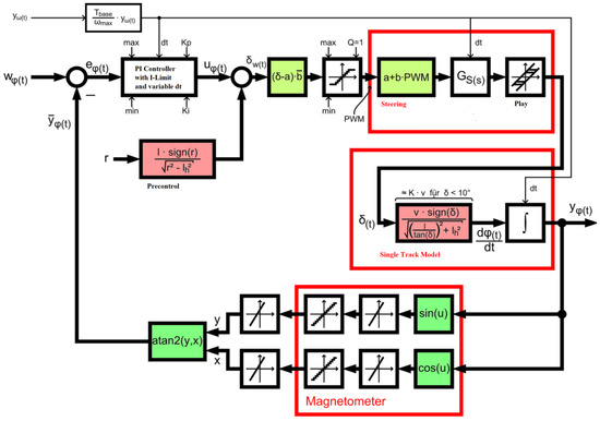 Some blocks have been colored in the block diagram of the orientation control loop. Blocks of the same color largely compensate for each other. In principle, the controlled system consists of the red boxes’ steering and single-track model. The single-track model by Rieckert and Schunck was considered the first to model the controlled system. The steering behavior of the robot was then experimentally determined to derive the mathematical relationship between the manipulated variable of the steering servo and the robot orientation.
