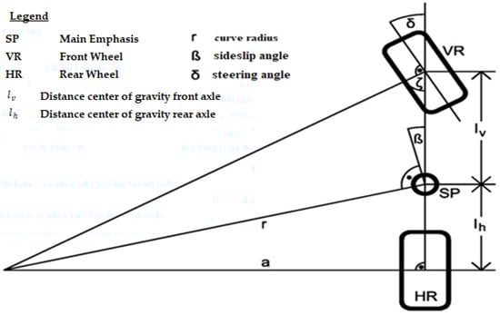 First, the single-track model by Rieckert and Schunck for small velocities and accelerations was considered. The slippage of the vehicle due to centrifugal forces was neglected. Figure 3 shows the geometric relationships of the single-track model used here.