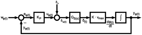 The controlled system can now be modelled with the knowledge gained from the single-track model. The entire steering train should provide a steering angle , resulting in a sideslip angle or curve radius . The steering, which consists of the servo motor and the steering linkage, converts a PWM signal into a steering angle . This transmission element is considered to be linear. The relationship is determined experimentally. The vehicle translates the steering angle into a curve radius via the underlying single-track model, which is directly related to the change in orientation . This relationship is mathematically precisely defined from the previous consideration.