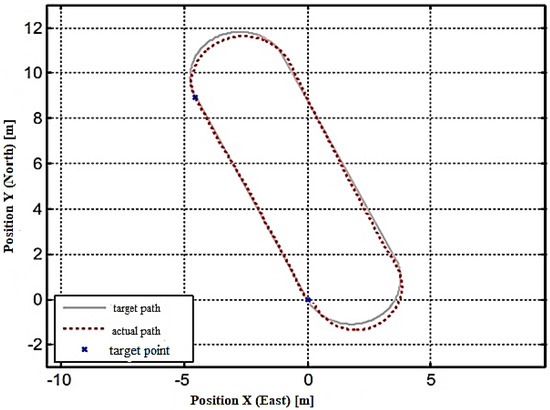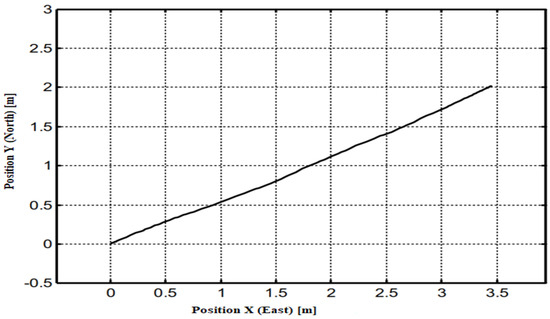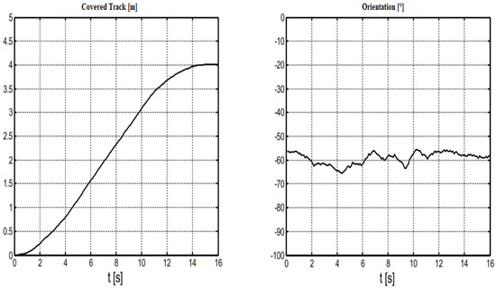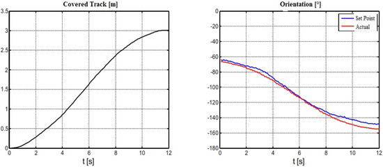 From Figure 8, it is seen that the driven trajectory is quite straight without any disturbances. Thus, we obtained the same S-shape results as before in Figure 6; however, for the orientation, the results recorded are different from those shown in Figure 6. From Figure 8, it is seen that there is full agreement between the actual value curve and the setpoint curve.