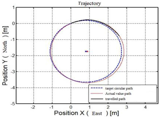 The robot’s trajectory shown in Figure 9 is drawn by a black line, which shows the circular motion of the robot in a nice manner. The red curve is drawn from the randomly selected trajectory points, which is used to compare the two results. The results in Figure 9 show only a small deviation between the travelled path and the actual path. In this case, the controller shows a smooth working scenario.