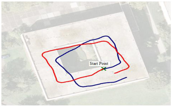 Two tracks are shown in Figure 10, i.e., clockwise and counter-clockwise. The trajectory results are measured and superimposed using the aerial photograph from Google Maps. The trajectory size was selected to reasonably fit the building for the best measurements and retain the aspect ratio and orientation.