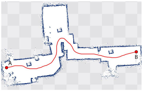 In Figure 11, three lines are drawn, represented the target value, actual path and target path. The results show agreement between the target and the actual path with a slight deviation. Multiple experiments were conducted in the healthcare system environment, e.g., patient ward, and practically evaluated the working of auto-MERLIN. These tests were performed to see the number of hits to static obstacles. To minimize the error/collisions, the robot’s orientation control was well programmed, as shown in Figure 2. The site selection was the general medicine ward of a local healthcare system. A distance of 12 m was selected between the doctor’s office and the patient’s ward. A flow diagram of the path followed by the robot using Google Maps is shown in Figure 12.