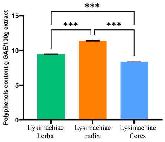 Comparative data of the content of total polyphenols obtained by the maceration extraction methods for Lysimachiae herba, radix, and flores extracts, with ethanol 40% (v/v). Results are indicated as mean ± SD of data (n = 3). Asterisks indicate statistical significance examined by ANOVA with Tukey post hoc test for multiple comparison among the extracts (*** p < 0.001).