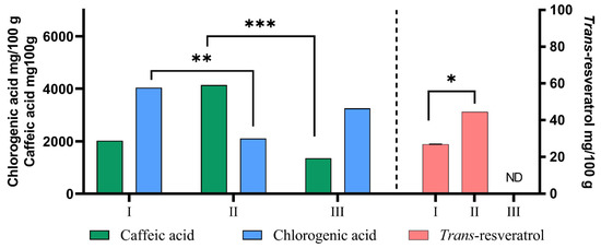 Comparative data of the content of chlorogenic and caffeic acids and trans-resveratrol identified in Lysimachia herba (I), radix (II), and flores (III) extracts, with ethanol 40% (v/v). Results are indicated as mean ± SD of data (n = 3). Asterisks indicate statistical significance examined by ANOVA with Tukey post hoc test for multiple comparison among the extracts (significant: * p < 0.05, ** p < 0.01, *** p < 0.001.