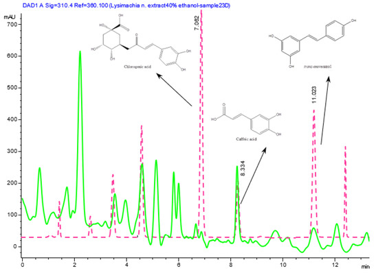 HPLC-DAD chromatograms at 310 nm: green line corresponds to the ethanolic solution of Lysimachiae herba samples with standard solution; red line corresponds to the standard solution.