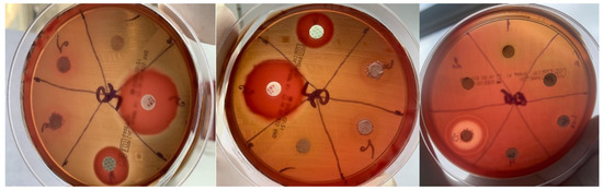 The results were expressed using the indicators S—sensitive, I—intermediate, and R—resistant to antibiotics specific to each bacterial strain used in the test.