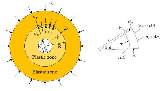 In Figure 1, a uniform in situ stress σs = γh (γ is weight per unit volume and h is the central depth of tunnel), r is vector diameter in the surrounding rock, R is radius of plastic zone, σr is radial stress, is radial stress at the interface between the elastic and plastic zones and is tangential stress.