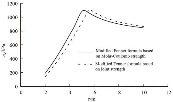 The tangential stress in the plastic zone of the surrounding rock determined by the modified Fenner formula based on joint strength is obviously smaller than that determined by the M–C strength, but the phenomenon is reversed in the elastic zone. The largest difference in tangential stress in the two kinds of modified Fenner formulas is observed at the elastic–plastic interface.