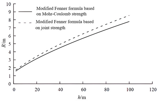 The radii of the plastic zone calculated by the modified Fenner formula based on joint strength and the modified Fenner formula based on M–C strength increased with the increase in tunnel depth. However, the radius of the plastic zone determined by the modified Fenner formula based on joint strength was larger than that based on the latter under the same depth.