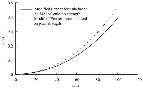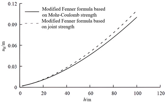 According to the abovementioned results, which include Formulas (16), (29), (32), (34) and (37), a series of analytical solutions comprises the modified Fenner formula based on joint strength. In this section, the difference between the modified Fenner formula based on joint strength and the modified Fenner formula based on M–C strength [7] for the unlined loess tunnel will be analysed and discussed.