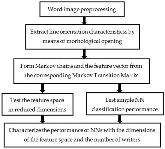The proposed method has significant advantages over existing techniques in retrieving handwriting information that is irrelevant to the language used. This is due to the fact that the word is analyzed along the writing axis as a time signal containing the orientation of the lines. The method is independent of the language in which the word is written even if the direction of writing is from right to left since the Markov chain is formatted independent of the direction of writing. As explained in this manuscript, this time-like signal has first-order Markov properties. This fact gives rise to the creation of the features. However, the procedure is very sensitive to the preprocessing stages, i.e., thresholding and thinning. Missing significant directional information in these preprocessing stages would significantly deteriorate the final feature vector.