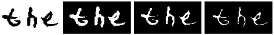 In more detail, the directionality of the lines in each location of a specific word, namely, the word “the”, is recorded using morphological openings along the word. In the case of SEs with a length of 3 pixels, the word is scanned pixel by pixel from left to right in strips at a width of 3 pixels (