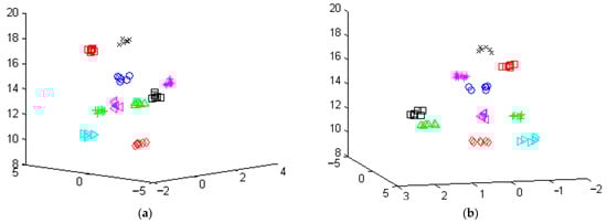 Figure 7a,b presents the separation of the clusters corresponding to 10 writers. Each cluster has six members resulting from the word ‘the’ written six times by each writer. Obviously, the clusters are separable, although we are working in the three dimensions which correspond to the three largest eigenvalues, while the use of the other dimensions can support better separability. For demonstration purposes, the ten clusters are depicted in the three most important directions, as can be seen in two different views with different aspects in